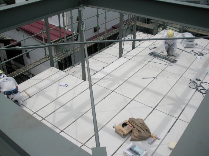 2、板吊至屋面,由人力扶正,對(duì)準(zhǔn)板位,緩慢下降,輕落在安裝位置上。